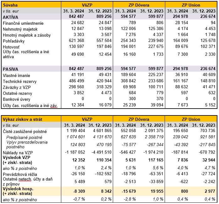 Na tomto mieste však treba zdôrazniť, že napriek uvedeným negatívnym očakávaniam všetkých troch zdravotných poisťovní, v súčasnosti všetky zdravotné poisťovne plnia zákonné požiadavky na splnenie platobnej schopnosti a faktúry uhrádzajú poskytovateľom zdravotnej starostlivosti v súlade so zákonnými požiadavkami riadne a včas. Pozitívne sa zatiaľ vyvíjal aj stav ich vlastného imania. Ku koncu tohto štvrťroka vykázala VšZP vlastné imanie v hodnote 41,2 mil. eur, ZP Dôvera v hodnote 189,6 mil. eur a ZP Union 36,9 mil. eur.
