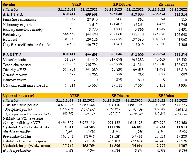 Tabuľky nižšie sumarizujú finančnú situáciu a výsledky hospodárenia troch zdravotných poisťovní: Všeobecná zdravotná poisťovňa, a. s. (ďalej „VšZP“), DÔVERA zdravotná poisťovňa, a. s. (ďalej „ZP Dôvera“) a Union zdravotná poisťovňa, a. s. (ďalej „ZP Union“).