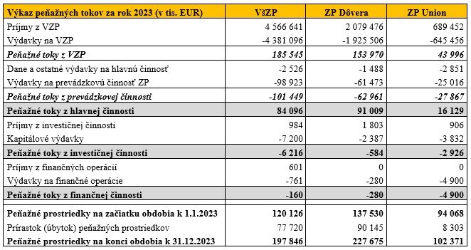 Vďaka dofinancovaniu sektora došlo vo všetkých zdravotných poisťovniach k zvýšeniu disponibilných peňažných prostriedkov. Najviac stúpla likvidita ZP Dôvera, ktorá má zároveň k dispozícii na bankovom účte najviac peňažných prostriedkov aj v absolútnej hodnote, a to až 228 mil. eur, čo je jej historický rekord. Zostatok peňažných prostriedkov ku koncu roka 2023 je u VšZP v hodnote 198 mil. eur a v prípade ZP Union je to 102 mil. eur.